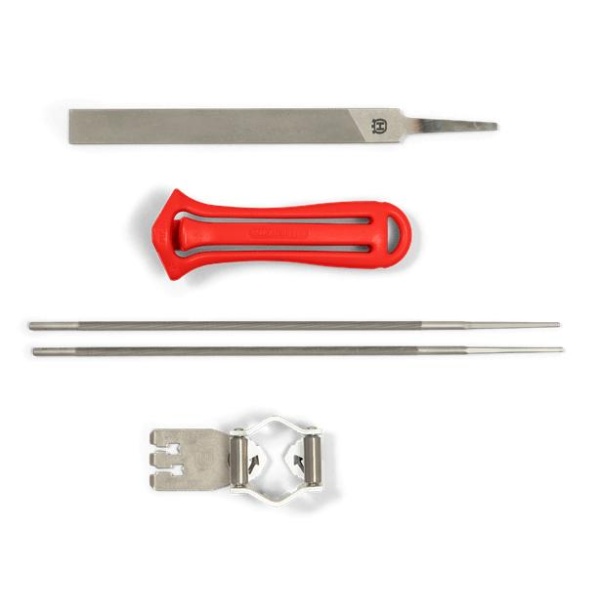 Komplett filesett som gjør det enklere å holde kjedet skarpt. Med et riktig filt kjede blir arbeidet enklere og tryggere. Filesettet inneholder et filhåndtak, en kombinasjonsmal eller en filmal og en dybdemåler, to rundfiler og én flat fil.