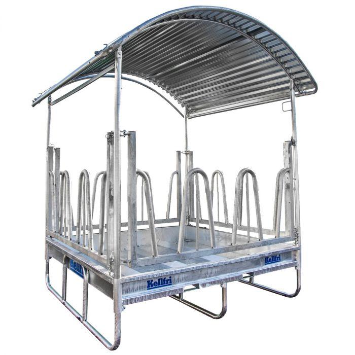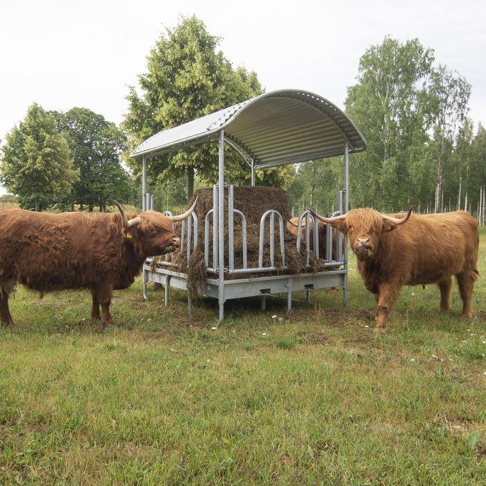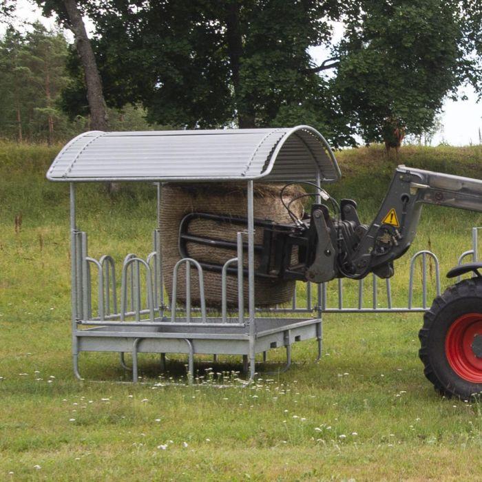 Fôrhekk med tak og bogbøyler, med 12 plasser for storfen• 12 fôrplassern• Grinder med bogbøylern• Justerbar takhøyden• 3 fotbøyler gir god stabilitetn• Tilpasset rund-/storballnnEn robust fôrhekk med yttermålene 200 x 200 cm og 4 grinder som kan åpnes.nnPåfylling av fôr gjøres raskt og enkelt ved å åpne en av de fire grindene, som svinges til siden. Bredden på åpningen er 190 cm, og siloballer i alle størrelser får plass i fôrhekken. Tre fôrplasser med kraftige bogbøyler på hver side.nnFôrhekken har pallegaffelfester, slik at du enkelt kan løfte og flytte den.nnFôret ligger godt værbeskyttet under taket, og er dermed alltid friskt og fint når dyrene skal ete. Taket er hev- og senkbart.nnTre fotbøyler gjør at fôrhekken står stødig og ikke synker ned i bakken under våte forhold.nnHele fôrhekken er galvanisert for lang levetid.nnFHBN passer utmerket til hornbærende dyr.nnMERK! Plastfilm/nett rundt høyballen skal fjernes før bruk.nnLeveres umontert.nnnHva er fordelen ved å bruke en fôrhekk?n• Det blir mindre svinn, ettersom dyrene ikke tråkker rundt i avvist grovfôrn• Du forbedrer hygienen ved fôringsplassen fordi du minimerer risikoen for kontamineringn• Du bruker mindre tid på å rengjøre ved fôringsplassen, og mindre grovfôr må kastes på gjødselhaugen.nn Du er selv ansvarlig for valget av fôrhekkmodell, siden du kjenner dyret ditt best. Det er viktig at du alltid følger Mattilsynets regler.nnTAKONTAKT FOR FRAKTPRIS!nLAGERSLITT!