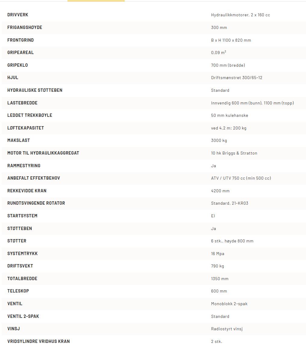Utstyret leveres komplett, montert og klart til bruk – enten du arbeider med vedtransport, rydding eller enklere løft i skogen. Den er CE-merket og konstruert med fokus på stabilitet, hvor både rammedesignet og de kraftige støttebenene gir trygghet selv ved arbeid i helning.