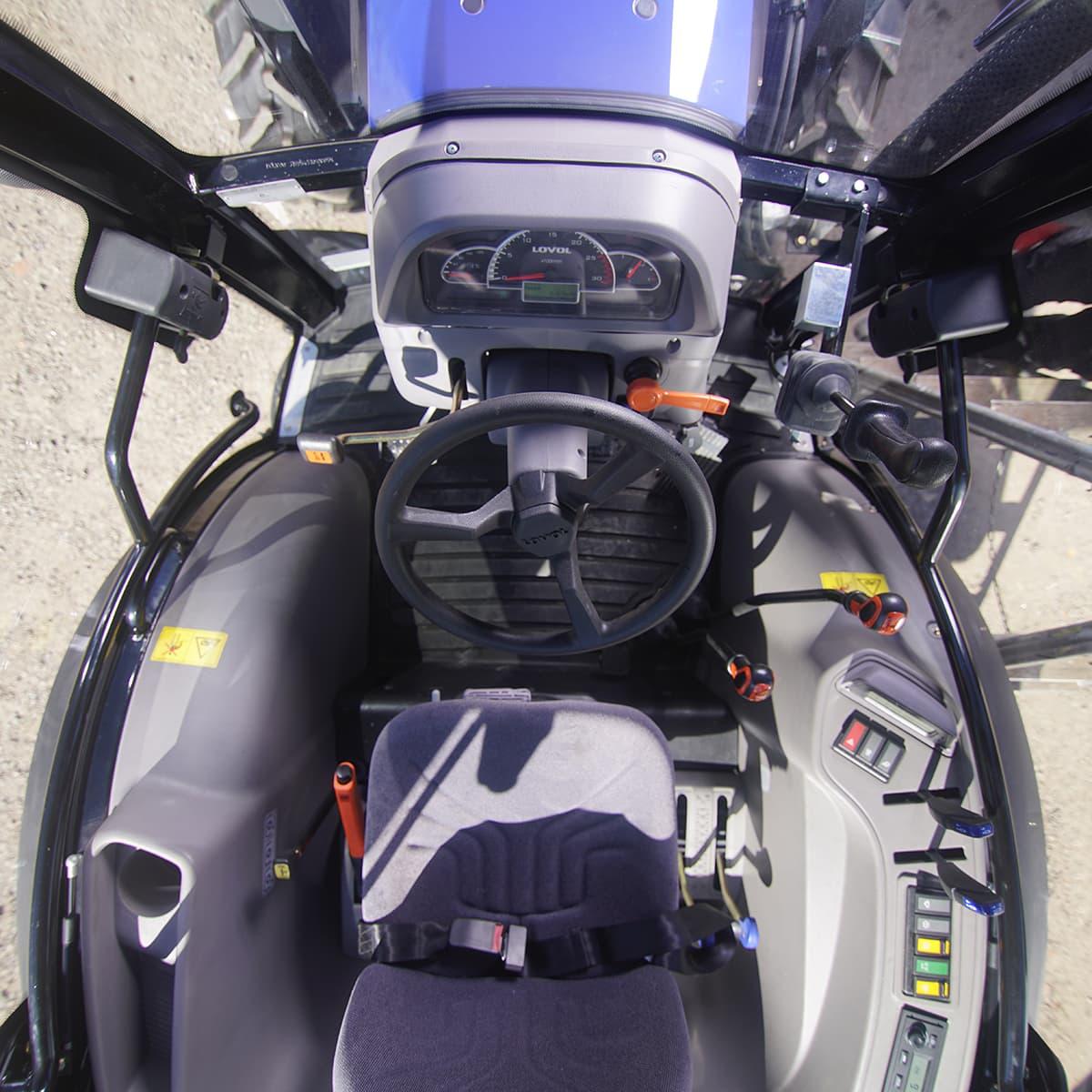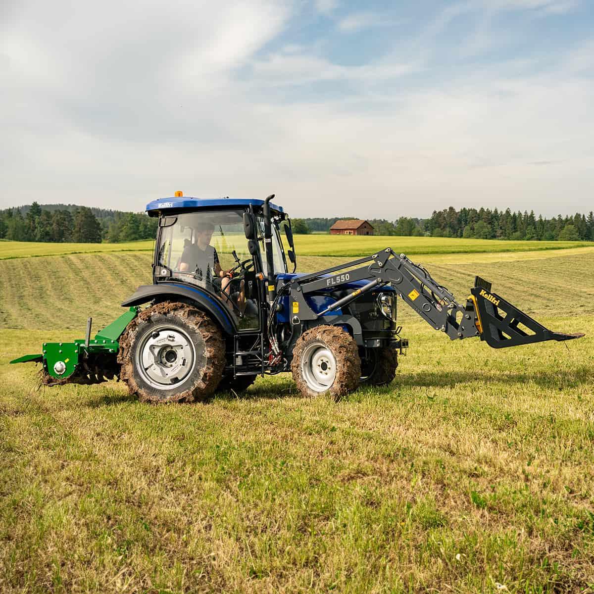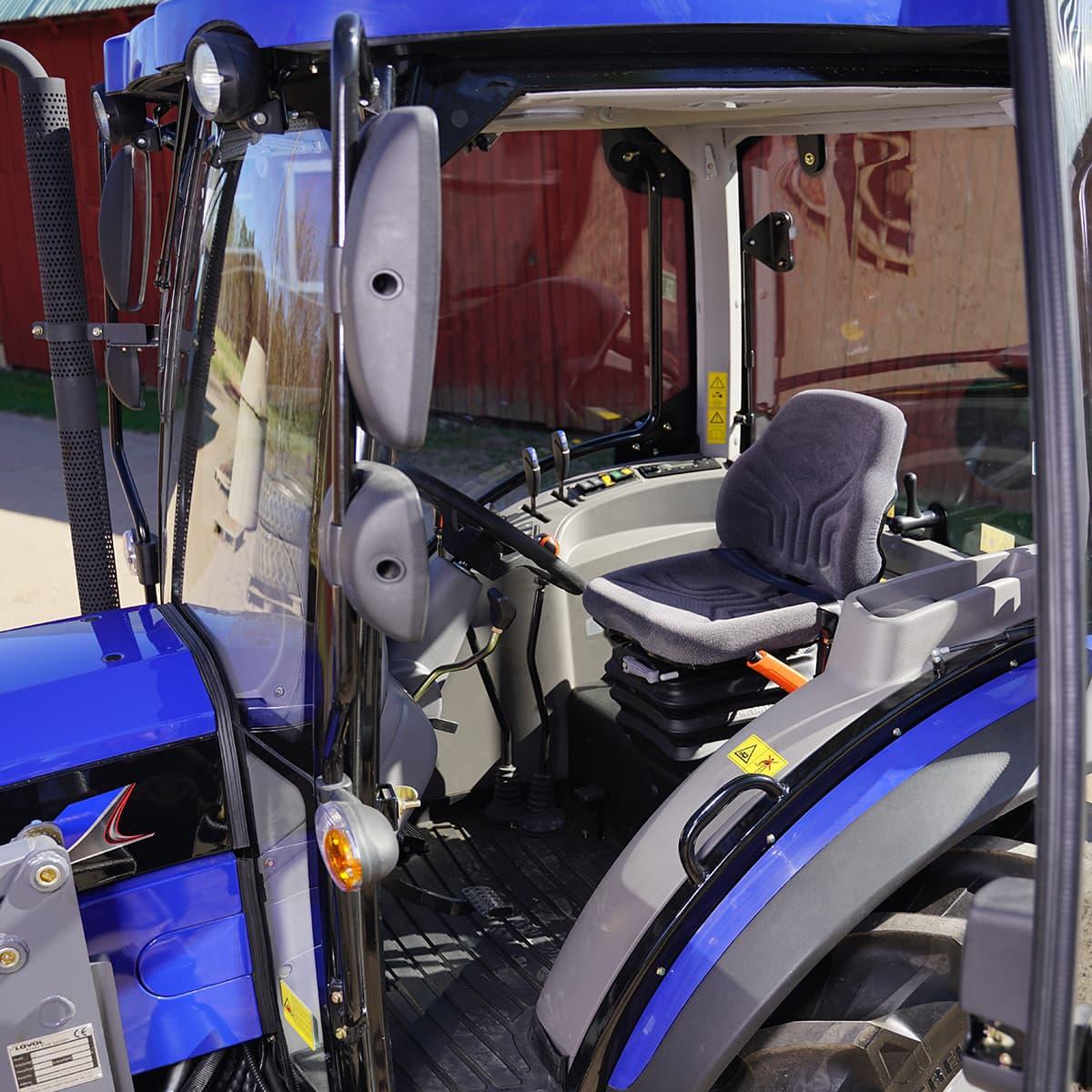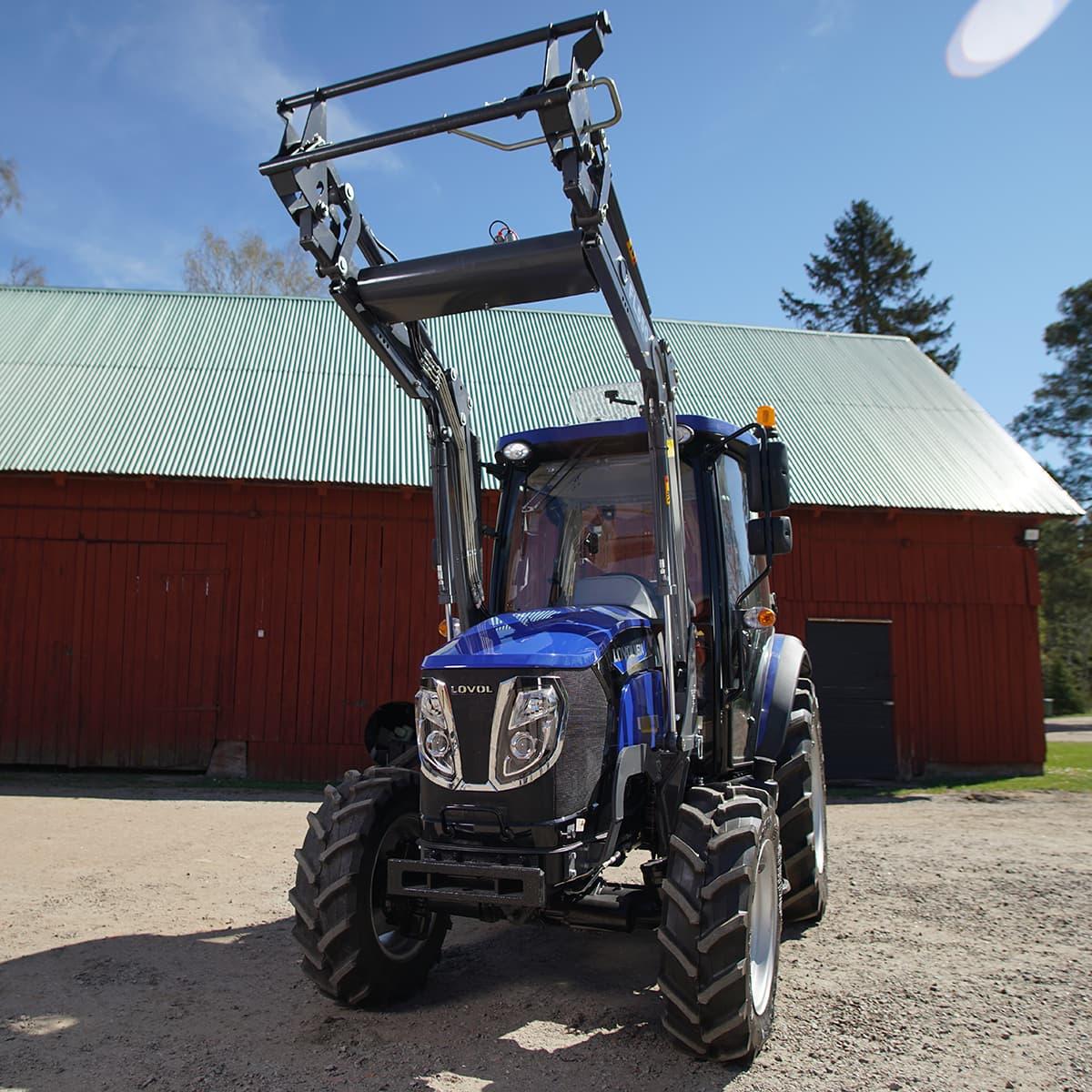 Traktor Lovol 50 hk 4WD med frontlaster, Stage VnTraktorpakke 2 inneholder:nn• Standardtraktornn• Frontlasternn• MotorvarmernnLovol 50 hk traktor – nå enda bedrenDen allerede populære Lovol 50 hk traktoren er oppgradert med blant annet AC, 4WD som kan velges elektronisk, og den drivstoffeffektive og driftssikre Hyundai Stage V-motoren som oppfyller utslippskravene i Stage V.nnKellfri har allerede tidligere vært markedsledende i 50 hk-klassen med traktoren fra Lovol, som er Sveriges mest solgte gårdstraktor. Nå er den videreutviklet ytterligere for å bli enda mer komfortabel og anvendelig på små og mellomstore gårder. Smidig å ta seg frem med, enkel å kjøre og behagelig å sitte i.nnErgonomisk og sikkernDu stiger enkelt inn og ut av traktoren – den hele sidedøren og de hengende pedalene gir behagelig plass. På vei opp/ned i traktoren finnes det også trinn med grep og solide håndtak som reduserer risikoen for å gli eller miste balansen.nnDet romslige førerhuset gir komfortabel plass også for lengre og tyngre førere. På det flate, lettstelte gulvet er det en isolerende matte som gir behagelig lydnivå inne i førerhuset. Traktoren har også lavere lydnivå enn forrige versjon, bare 75 dB.nnDu sitter komfortabelt i en fjæret og stofftrukket Grammer-stol som er utstyrt med sikkerhetsbelte. Vinkelen på rattet kan justeres, og alle betjeningselementene er enkle og ergonomisk plassert.nnMed AC og varme kan du enkelt regulere temperaturen i førerhuset året rundt. Hvis du foretrekker lufting, kan bakruten åpnes eller settes i luftestilling. Takluke og solskjerm gir ytterligere muligheter for regulering av temperatur og lufting i førerhuset.nnBuede glassruter, helglassede dørsider og nå oppdaterte doble sidespeil, ett stort og ett lite, gir god sikt som øker sikkerheten og forenkler arbeidet.nnDu ser og synes godt selv om du jobber i mørket, takket være god belysning foran og bak.nnRadio som standard.nnLettkjørt med valgbar 4WDnDu skifter enkelt mellom foroverdrift og revers ved hjelp av en spak ved siden av rattet. Det samme gjelder gassreguleringsspaken, noe som gir en intuitiv kjøreopplevelse. Maks. hastighet er 38 km/t. Det digitale speedometeret gir god kontroll over kjøringen sammen med displayet som viser temperatur, turtall og drivstoffnivå. D18-motoren fra Hyundai oppfyller utslippskravene i Stage V, og gir stabil drift, god drivstofføkonomi og lavt støynivå. Traktoren er utstyrt med Defa motorvarmer, som gir skånsom kaldstart. Motorvarmeren er lett tilgjengelig ved innstigningen.nnTraktorens firehjulsdrift, 4WD, gir god trekkraft og fremkommelighet samtidig som det blir enklere og sikrere å håndtere traktoren når frontlasteren er montert. Firehjulsdriften er elektronisk valgbar, og kan raskt kobles inn og ut. 12 gir framover/bakover gjør det enkelt å tilpasse arbeidsfarten. Den synkroniserte girkassen (1-2-3-4) gir lav effektap og gjør det enkelt å skifte gir. Traktoren er dessuten utstyrt med en fjærende clutchpedal som gjør at det kreves mindre kraft for å gire.nnDragkroken (tilvalg) og kombinasjonen med 540/1000 kraftuttak gir flere muligheter når du skal velge redskap. Det finnes også to dobbeltvirkende hydraulikkuttak som gir kapasitet til å manøvrere de fleste tilbehør.nnTRELLEBORG radialdekk foran og bak gir myk og god komfort, god trekkraft og bedre bæreevne med frontlaster.nnGarden-Galaxy Pro allround-dekk finnes som tilvalg for deg som vil kjøre på gress og følsomme overflater – men likevel ønsker å kunne kjøre på litt hardere underlag.nnFørerhusetn• Romslig førerhus – passer også for lange og tyngre førere nn• AC, varme og ventilasjon nn• Flatt gulv med isolert matte for et mer behagelig lydnivånn• Justerbar rattvinkelnn• Digitalt speedometer og display med temperatur/turtall/drivstoffnivå nn• Ergonomisk plasserte betjeningselementernn• Buede ruter og helglassede dørsider for beste sikt og inn-/utstigningnn• Bakruten kan åpnes/ventileresnn• God arbeidsbelysningnn• Fjæret Grammer-sete med sikkerhetsbeltenn• Takluke og solskjermer nn• Innsteg med langt og kraftig håndtaknn• Doble sidespeil nn• Hel sidedør og hengende pedaler for enkel inn- og utstigningnn• Lavt lydnivå – kun 75 dB nn• Radio som standardnnDriftssikkerhetn• Maks. hastighet på 38 km/tnn• 4WD gir god trekkraft og fremkommelighet, samt sikker håndtering med laster montertnn• Elektronisk valgbar 4WD gjør det enkelt og raskt å koble inn og ut 4WDnn• Forover/bakover endres enkelt med en spak ved rattet, og det samme for håndgassennn• 12 gir forover/bakover gjør det enkelt å tilpasse arbeidsfartennn• Synkronisert girkasse (1-2-3-4) gir et lavt effektap og gjør det enkelt å skifte girnn• Fjæret clutchpedal gjør at det ikke trengs stor kraft for å girennGirnL1: 2,7 km/tnL2: 4,1 km/tnL3: 5,2 km/tnL4: 8 km/tnM1: 6,9 km/tnM2: 10,4 km/tnM3: 13,1 km/tnM4: 20,2 km/tnH1: 12,8 km/tnH2: 19,3 km/tnH3: 24,4 km/tnH4: 37,6 km/tnAndre funksjonern• To dobbeltvirkende hydraulikkuttak gir kapasitet til å manøvrere de fleste tilbehørnn• 540/1000 kraftuttak gir flere muligheter når du skal velge redskapnn• Maks. løftekraft trepunktsfeste 2200 kgnn• Moderne førerhus med helglassede dører og buede ruter for beste siktnn• TRELLEBORG-radialdekk foran og bak gir myk og god komfort, god trekkraft og bedre bæreevne med frontlaster.nn• Defa motorvarmer – for mer skånsom kaldstartnn• Lett tilgjengelig tanklokk for enkel påfylling av drivstoffnnFrontlastern• En kraftig frontlaster med optimal løftehøyde og tippvinkelnn• Leveres med Euro-festenn• Tippvinkel 50°nn• Løftekraft maks. 900 kgnn• Beskyttet 3-funksjonsuttaknn• ParallellføringnnEn solid frontlaster til 50 hk traktor fra Lovol. Optimal løftehøyde på 2820 mm og en tippvinkel på 50°. Parallellføring som justerer for høyden ved løfting, og som gjør at du holder redskapet i konstant vinkel.nnFrontlaste
