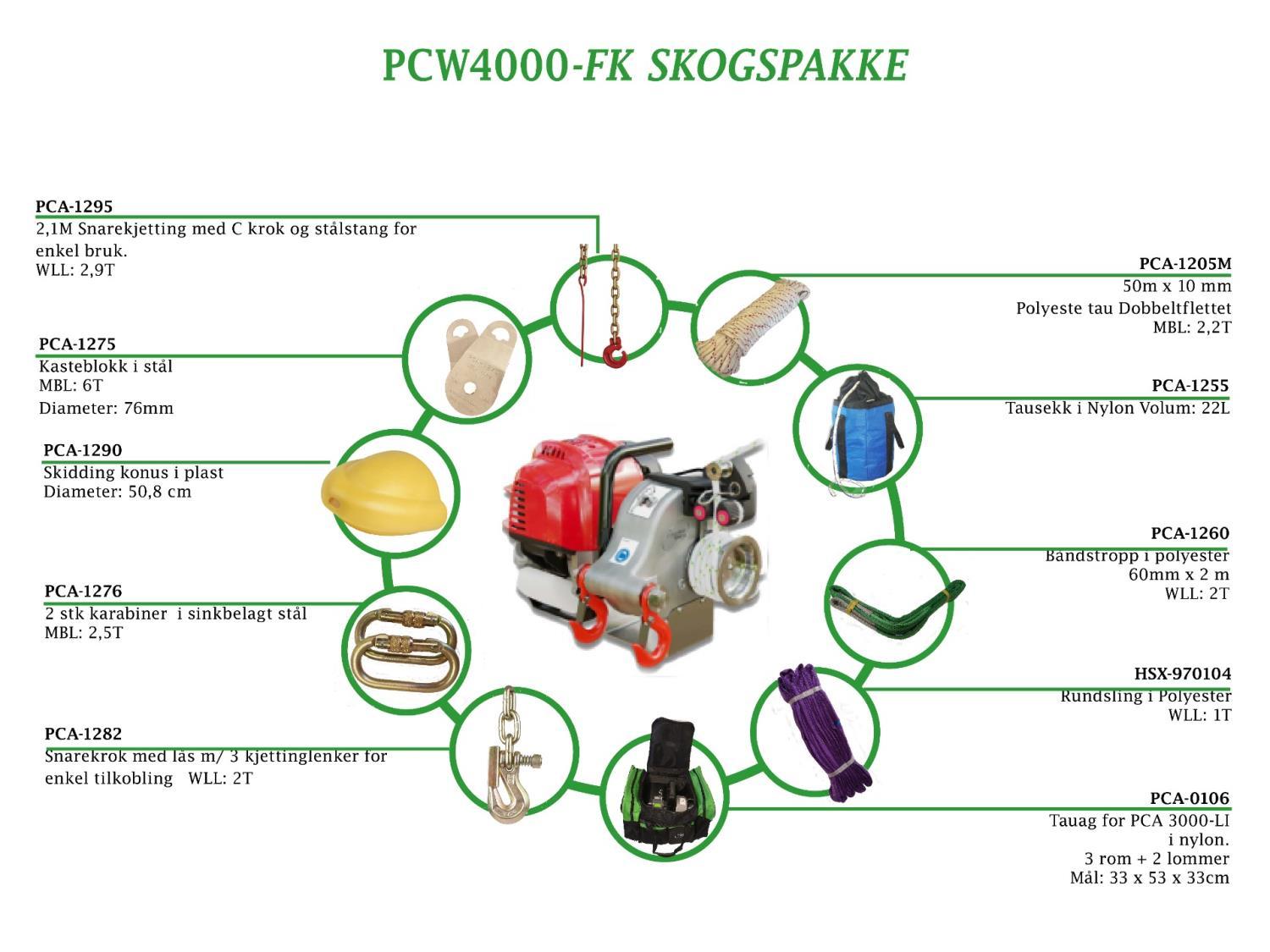 PCW4000-vinsjen og tilbehør er tilpasset for å trekke ut tømmerstokker. Den inkluderer glidekeglen (PCA-1290), som forhindrer at stokkene setter seg fast i røtter, stubber og andre hindringer. Tauet på 10 mm x 50 m lar deg nå trær der de er. Når det gjelder kasteblokken, vil det være nyttig for å få løft i stokken eller om nødvendig å doble trekkraften. Kombinert med 1000 kg kraften som vinsjen PCW4000 tilbyr, får du 2000 kg kraft!