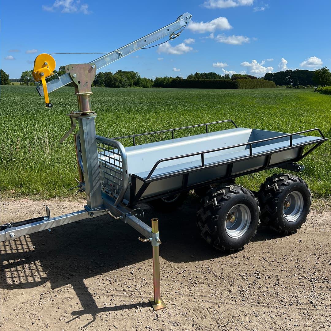 En perfekt tipp- og skogsvogn til ATV, som kan brukes til alle arbeidsoppgaver på gårdenn• Avtakbart innleggsplan med 2 mm galvanisert metallplatenn• Kraftig V-boggi for god klatreevne i skogsterrengnn• Kraftig mekanisk svinghuslåsing Tower2+nn• 4 stk. forsterkede og tannede opp- og nedfellbare støtternn• 2 stk. justerbare sidestøtteben for lasting inkludertnn• Krantårnfestet kan justeresnn• Håndvinsj med lås inkludertnn nn«Som skogbruker vil og kan man ikke alltid trekke frem den store tømmerhengeren og traktoren hvis man vil komme til på trange steder og/eller når man bare trenger å kjøre ut noen stokker. Da er denne vognen til firehjulingen et kjempegodt alternativ som man har stor nytte av i skogen. Og det er utrolig gøy å kjøre med den!»n– Oscar Svantesson, jord- og skogbrukernn nnAvtakbart innleggsplannVognen har et avtakbart innleggsplan med 2 mm galvanisert metallplate. Med lasteplanet montert kan du kjøre løse masser, og uten lasteplan kan du transportere tømmer. Frem- og baklemmen er avtakbare. Kraftig V-boggi, flyttbare stolper og grind for tilpasning til ulike virkelengder. Festeøye foran på planet for tipp med vinsj og høy tippvinkel. nnNår du skal omstille tippvognen fra kjøring av løse masser til skogsvogn for kjøring av tømmer uten lasteplanet, løsner du to splinter og fjerner lasteplanet. 4 stk. forsterkede og tannede opp- og nedfellbare støtter slik at du kan minimere løftehøyden når du laster tømmer. Stabil grind for å hindre at lasten forskyver seg.nnGrovmønstrede dekk for godt grep og bæreevne i skogen. Dekkene har en dimensjon på 22×11 -10, og det er lett å pumpe inn luft via dekkventilene.nnKraftig mekanisk svinghuslåsing med sju posisjoner for å kunne vinsje tunge lass i ulike retninger. Tårnet Tower2+ kan også dreies 360°.nn2 stk. justerbare sidestøtteben ved lasting inkludert, samt 1 stk. støttefot til draget, justerbar med sveiv. Dette gjør at vognen står stabilt ved tilkobling og frakobling av trekkjøretøy, og ved lasting og lossing. Støttebena på de fremre gavlene på vognen kan heves, senkes og trekkes ut i sideretning.nnLengden på bommen kan justeres fra 160–220 cmnnHele vognen er laget av galvanisert metall, noe som gjør den betydelig mer slitesterk og gir den lengre levetid. Leveres med gul håndvinsj med lås. Dreibar kulehanske for 50 mm kulekoblingnnVognen leveres umontert.nn