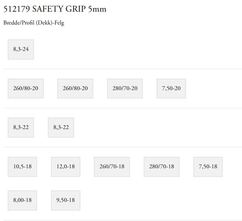 SE BILDE FOR STØRRELSERnnSafety Grip 5 mm er en superlett og allsidig traktorkjetting til bruk i lettere oppgaver. Den er det selvsagte valget for de som ikke fa°r god nok fremkommelighet med piggdekk, tar kjettingen mye pa° og av, eller kjører pa° vekslende vei- og føreforhold. Liggende pa°sveiste lange og høye sliteelementer (flatpigger) som gir svært god gripeevne og slitestyrke. nn nnOverflatebehandlet med BioCorrnNyhet! Safety Grip er overflatebehandlet med med BioCorr, som beskytter kjettingen mot rust under lagring og transport. BioCorr er vannbasert, biobasert og biologisk nedbrytbart, og representerer et miljøvennlig alternativ til tradisjonelle petroleumsbaserte produkter.nn nnAll ny produksjon av Safety Grip vil benytte BioCorr som overflatebehandling. Kjetting som ble produsert før implementeringen av BioCorr vil fremdeles selges i overgangsperioden.nnTeknisk Data SAFETY GRIP 5x5mmnBanekjetting 5×5 firkantnPigg FlatpiggnKrok 6mmnSidestropp 5mm firkantnSidekjetting 6mmnStrammekjetting NeinYtterlås Låsearm med sjakkelnInnerlås Låsearm med sjakkelnBanelås Assymetrisk kobling – 5mmnOverflate behandling BioCorrnOverflatebehandling sidekjetting BioCorrnInnpakning TrekassenPakke innholdsliste 1 par + brukermanualnnn