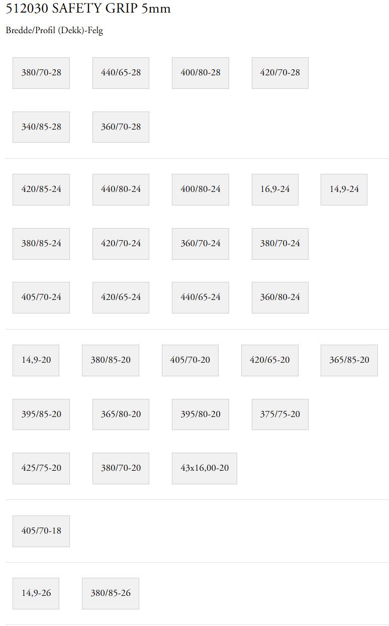 SE BILDE FOR STØRRELSERnnSafety Grip 5 mm er en superlett og allsidig traktorkjetting til bruk i lettere oppgaver. Den er det selvsagte valget for de som ikke fa°r god nok fremkommelighet med piggdekk, tar kjettingen mye pa° og av, eller kjører pa° vekslende vei- og føreforhold. Liggende pa°sveiste lange og høye sliteelementer (flatpigger) som gir svært god gripeevne og slitestyrke. nn nnOverflatebehandlet med BioCorrnNyhet! Safety Grip er overflatebehandlet med med BioCorr, som beskytter kjettingen mot rust under lagring og transport. BioCorr er vannbasert, biobasert og biologisk nedbrytbart, og representerer et miljøvennlig alternativ til tradisjonelle petroleumsbaserte produkter.nn nnAll ny produksjon av Safety Grip vil benytte BioCorr som overflatebehandling. Kjetting som ble produsert før implementeringen av BioCorr vil fremdeles selges i overgangsperioden.nnTeknisk Data SAFETY GRIP 5x5mmnBanekjetting 5×5 firkantnPigg FlatpiggnKrok 6mmnSidestropp 5mm firkantnSidekjetting 6mmnStrammekjetting NeinYtterlås Låsearm med sjakkelnInnerlås Låsearm med sjakkelnBanelås Assymetrisk kobling – 5mmnOverflate behandling BioCorrnOverflatebehandling sidekjetting BioCorrnInnpakning TrekassenPakke innholdsliste 1 par + brukermanualnnn