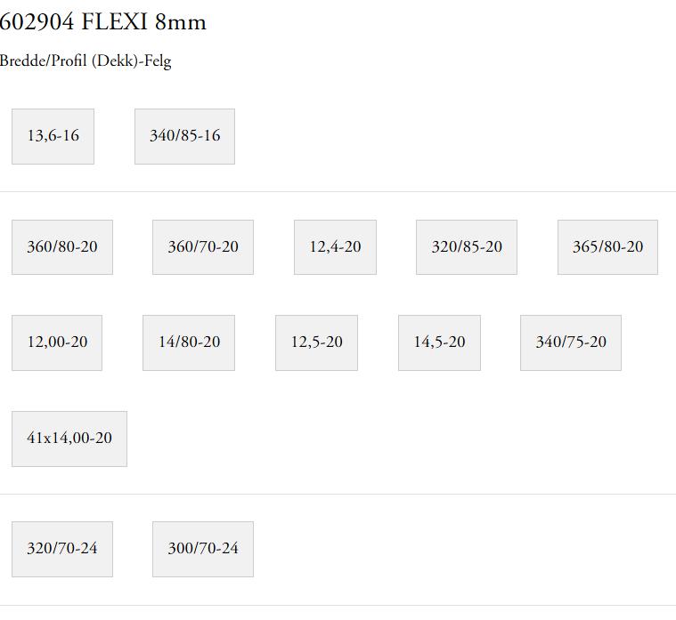 SMT Flexi leveres i to dimensjoner: 8 og 9,5 mm. Kjettingen ma° tilpasses – med enkle ha°ndgrep, uten bruk av verktøy, kan kjettingen tilpasses ba°de nye og slitte dekk, og gjerne ogsa° etter bytte av dekkdimensjon. Til andre dekkdimensjoner enn de som er oppgitt i prislisten tilbyr vi SMT Traktor.